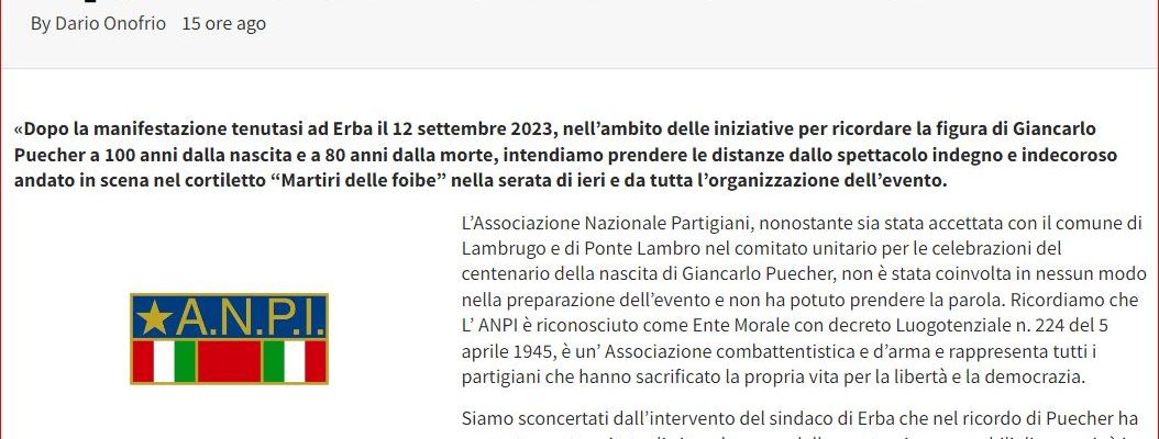 L’esclusione dell’ Associazione Nazionale Partigiani d’Italia – ANPI dalla manifestazione pubblica svoltasi ad Erba sulle cui modalità quantomeno “discutibili” non mi soffermo è un fatto molto grave sopratutto alla luce del fatto che l’ANPI sia stata precedentemente accettata con il comune di Lambrugo (CO) e quello di Ponte Lambro (CO) nel comitato unitario per le celebrazioni del centenario della nascita di Giancarlo Puecher – giovane Partigiano ventenne condannato a morte e fucilato dai criminali nazifascisti.